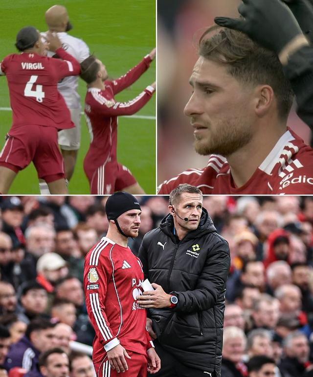 范戴克在与姆贝乌莫争顶时,不慎肘击到队友麦卡利斯特,阿根廷中场接受包扎后继续比赛。